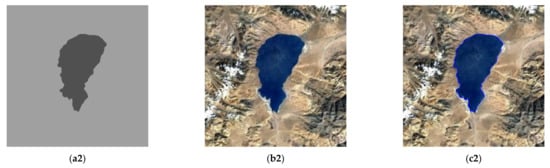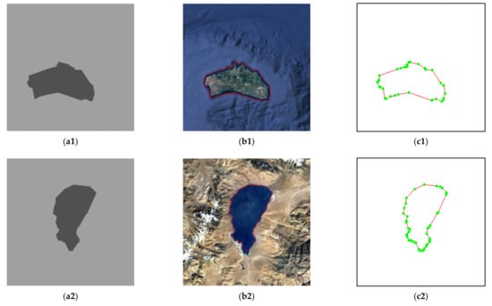 The proposed algorithm is used to experiment in Figure 10b1,b2, and the experimental results are shown in Figure 11. Among them, Figure 10c1,c2 are the object extraction results. The solid green dots in the figure represent the nodes used to form the polygon, and the number of nodes is 35 and 44, respectively. Each group of nodes is sequentially connected with solid red lines to form polygons, which are used to fit island and lake objects, respectively. The formed polygon is superimposed with the experimental image (Figure 10b1,b2) for visual evaluation. The superposition results are shown in Figure 11b1,b2. It can be seen from the figure that the polygon formed by the experimental results can not only locate the island and lake but also accurately fit their geometry. In order to quantitatively evaluate the experimental results, the extracted object results are converted into segmentation results, as shown in Figure 11a1,a2.