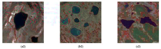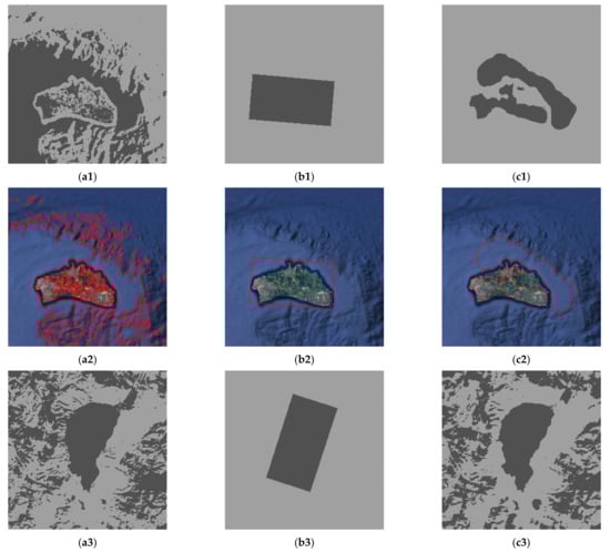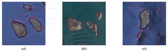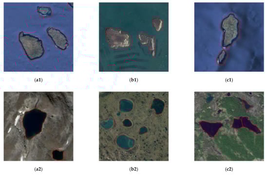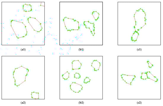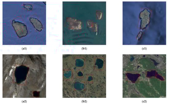 The proposed algorithm is used to experiment with the remote sensing image in Figure 13. The experimental results are shown in Figure 14. In the figure, the solid green dots represent the nodes constituting the ground object geometry, and the solid red lines represent the extracted object geometry. Among them, Figure 14a1–c1 shows the results of extracting island objects, and the number of extracted objects is four, three, and two, respectively, which is the same as the visual interpretation results in the experimental image. Figure 14a2–c2 shows the extracted lake results, and the number of extracted objects is two, six, and four, respectively. The extraction results of the first two images are consistent with the visual interpretation results, while the number of surface objects visually interpreted in Figure 14c2 should be 3. In the experimental results, two polygons are used to fit a lake object.