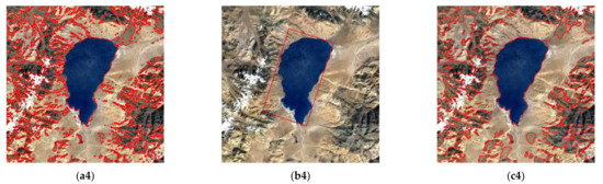 Experimental results of comparison algorithm: (a1) Pixel based island segmentation; (b1) Rule mark island segmentation; (c1) Active contour island segmentation; (a2) Pixel based island extraction; (b2) Rule mark island extraction; (c2) Active contour island extraction; (a3) Pixel-based lake segmentation; (b3) Rule mark lake segmentation; (c3) Active contour lake segmentation; (a4) Pixel based lake extraction; (b4) Rule mark lake extraction; (c4) Active contour lake extraction.