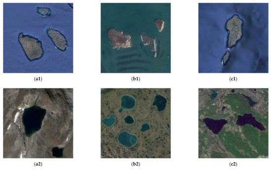 Figure 13 shows six images selected from the aerospace remote sensing object detection data set [] marked by Northwest University of technology, all of which are 256 × 256 pixels. Figure 13a1–c1 shows three island images, and Figure 13a2–c2 shows three lake images. It can be seen from the image that the spectral measures of the pixels in the background area of the three island images are evenly distributed, and the spectral measures of the object pixels are quite different. The spectral measure distribution of the pixels in the background area of the three lake images is more complex, while the spectral measure distribution of the object pixels is more uniform. The geometric shapes of the objects in these six images show irregular characteristics.