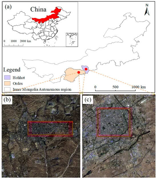 Study areas and corresponding validation areas. (a) Geographical location of the study area. (b) Main built-up area in Ordos City; the area within the red box is verification area S1. (c) Main built-up area in Hohhot City; the area within the red box is verification area S2.
