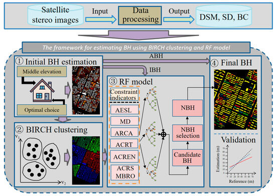 We propose a framework based on BIRCH clustering and RF classification models [] for estimating the BH based on satellite stereo images. As shown in Figure 2, the BH estimation method can be divided into four parts: