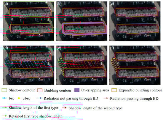 (1) AESL: we use maximum minimum linear stretching to obtain the SD of buildings in panchromatic images with higher spatial resolution in stereo images. To accurately calculate the length of the SD for buildings, we propose a calculation method that considers the shadow edge information. It is assumed that there exists a set of contour points for building BD (as shown in Figure 3a). Then, bc is expanded outward and overlapped with the shadow (as shown in Figure 3b). The point set (as shown in Figure 3c) closest to the building contour in each direction of the overlapping part (the vector direction between the points in bc and the corresponding overlapping points) is obtained. The points in bso are then screened, and rays formed along the direction of illumination starting from themselves are used to determine whether the ray passes through BD (as shown in Figure 3d). Finally, as shown in Figure 3e, the point set describing the rays in bso that do not pass through BD is preserved. Starting from the point itself in the sbso, a pixel-by–pixel search is conducted along the direction of illumination, and the length of overlap with the shadow in the search direction is measured until the shadow cuts off or enters the contour of another building. When closely located buildings obstruct shadows, existing methods often only calculate the shadow length between buildings. This approach ignores the length information from the edges of the SD, resulting in a shorter calculated shadow length []. To consider the length of the shadow edges, we divide the statistical shadow length into two categories: the SD length obtained by the normal SD cutoff, and the SD length obtained by searching for other buildings. As shown in Figure 3f, to avoid interference from the length of extremely short shadows, we remove the SD lengths that are less than half of the maximum length of shadows of the same type. Meanwhile, if only a second type of shadow length appears in a building’s statistics, the average length of the second type of SD is used as the final SD length of the building. Otherwise, the average length of the first type of SD is used as the final SD length of the building. The calculation formula for variable AESL is as follows: