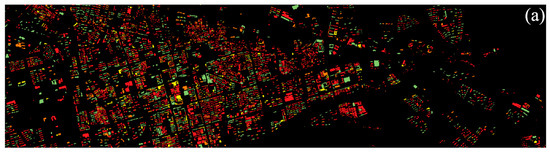 Our proposed method reselects the height for IBH buildings, whereas ABH buildings use the initial BH estimation results. Therefore, the accuracy of the initial BH estimation results determines the likelihood of IBH buildings being correctly identified and further processed. In most previous studies, the height of each floor of a building was assumed to be 3 m [,,]. Therefore, 3 m is used as the error limit. If the initial BH estimation result is within 3 m of the reference height, it is considered accurate. Otherwise, the initial BH estimation result is considered inaccurate. Since the classification is mainly based on the ground elevation of buildings, we conducted an accuracy analysis on the same ground elevation as the height of the buildings. We randomly selected 5240 buildings and 7202 buildings in the main built-up areas of validation areas S1 and S2, respectively, for the validation analysis. Figure 4 presents the four classification scenarios (, , , and ). Among them, and represent correct classifications, whereas and represent incorrect classifications. Based on the classification results, most buildings were correctly classified. Buildings that were not correctly classified are often located in densely populated areas (with missing or incorrect ground elevations, making it difficult to select the ground elevation), or have a complex BC (with multiple changes in roof elevations and large differences in roof elevation errors). The classification accuracies are listed in Table 1. In both validation areas, the accuracy of the ground elevation classification is greater than 80% and both are better than the accuracy of the BH classification. This is because the evaluation based on ground elevation classification does not consider the roof elevation, resulting in higher classification accuracy. However, whether evaluating based on ground elevation or BH, the proposed method achieves high classification accuracy, thus verifying the reliability of the method.
