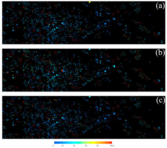 Building height (BH) data are used in various fields, such as pollutant diffusion [], urban climate [,,], land use [], and socioeconomic development []. At present, both cities that have not yet obtained building basic data and those that have already obtained building basic data need to continuously automate the acquisition of building attribute information (such as BH). However, manual BH measurement methods cannot address this demand. Due to the swift advancement of aerospace technology, both airborne and satellite data now boast high spatial and temporal resolutions, meeting the requirements for obtaining BH data over extensive regions. Three main types of data sources have been used for BH extraction: light detection and ranging (LiDAR) data [,,,,], synthetic aperture radar (SAR) images [,,], and optical images [,,,,,].