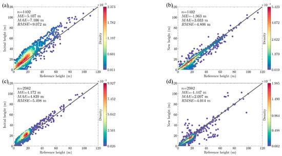 Evaluation of the accuracy of the initial BH and NBH for IBH buildings in validation regions S1 and S2. (a,b) are the accuracy evaluations of the initial BH and NBH of IBH buildings in the validation area S1, respectively. (c,d) are the accuracy evaluations of the initial BH and NBH of IBH buildings in the validation area S2, respectively.