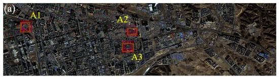 The experimental data were obtained from GF-7 stereo imaging data. The panchromatic image resolution captured by the two-line array camera on the GF-7 satellite was 0.8 m for the forward view image (FWD) and 0.65 m for the backward view image (BWD). We used the FWD and BWD images from GF-7 to generate DSM image data with a 1-m resolution using the more global matching (MGM) algorithm. Moreover, we extracted BC and SD data from the BWD using the GEOWAY and ENVI 5.3 commercial software applications [], respectively. As shown in Figure 1a, the study areas were in the cities of Hohhot and Ordos in the Inner Mongolia Autonomous Region of China. The first study area is the eastern urban area in Dongsheng District, Ordos City (Figure 1b). The topography of the Dongsheng District is mainly characterized by hills and valleys in the east and undulating plateaus in the west. The buildings in the area are generally simple in shape, predominantly consisting of rectangular structures, with most buildings being under 40 m in height. The second study area is in the urban region of Hohhot City, as depicted in Figure 1c. Hohhot City is primarily characterized by two major geomorphic units, the northern Daqing Mountain and the southeastern Manhan Mountain, which feature mountainous terrain. The southern and southwestern regions are defined by the Tumochuan Plain, where the terrain gradually slopes from northeast to southwest. The urban area itself sits at an altitude of approximately 1040 m and is home to a mix of dense and varied buildings.