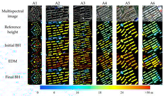 All the buildings used for validation were evaluated to assess the proposed method’s performance. To compare the reliability of the methods, we chose the method of elevation difference model (EDM) based on DSM [] as the comparative method. As shown in Figure 8a, the buildings in validation area S1 are densely arranged, and the shadows are longer. In particular, in the central built-up area with tall buildings (on the left of validation area S1), many shadows are present between the buildings, and the ground is less exposed. The ground elevation steadily becomes more complex toward the right side of verification area S1. As shown in Figure 8b, the buildings in validation area S2 are arranged in a more orderly and more dense manner, with more buildings of similar heights. Although the impact of building shadows in S2 is not as significant as in S1, numerous non-ground disturbances are present, such as vegetation, vehicles, and small man-made objects between buildings. Six small regions from validation regions S1 and S2 were extracted to compare the initial BH estimation results with the final results (as shown in Figure 9). The small area map clearly shows that the three small areas (A1–A3) in S1 have more shadows on the buildings, covering much of the ground, and the shapes and heights of the buildings are also diverse. The buildings in the three small areas (A4–A6) in S2 are often disturbed by vegetation or non-ground objects, but more buildings of the same height are present. A comparison of the height maps of different small regions shows that the initial BH estimation results perform better in S2 than in S1 because S2 has more ground exposure, making ground elevation selection simpler. Therefore, a small number of buildings with more ground interference have a larger height error than the reference building. This is due to the EDM method requiring a large and stable amount of ground elevation to obtain accurate ground elevation. Therefore, when shadows and dense buildings result in a lack of ground elevation, the accuracy of ground elevation selection decreases. Similarly, although the initial BH estimation method does not require many ground elevation values, vegetation and shadows can cause outliers, affecting the selection of ground elevation. After processing with the proposed method, the correction of the BH is obvious, particularly in A1, where many buildings with significant height errors are corrected. This proves that the height replacement of buildings with similar attributes is reliable, and the proposed method can effectively handle the problem of BH estimation errors caused by a large amount of occlusion of the building’s ground. The maps of each small area show that the closer the area is to the concentration of buildings with similar heights, the closer the building height will be to the reference building height after correction.
