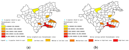 The online check-in popularity classification of the coastal Internet celebrity street in Dalian City. (a,b) are the thermodynamic value of the Online weighted area and the thermodynamic value of the Online entropy method.