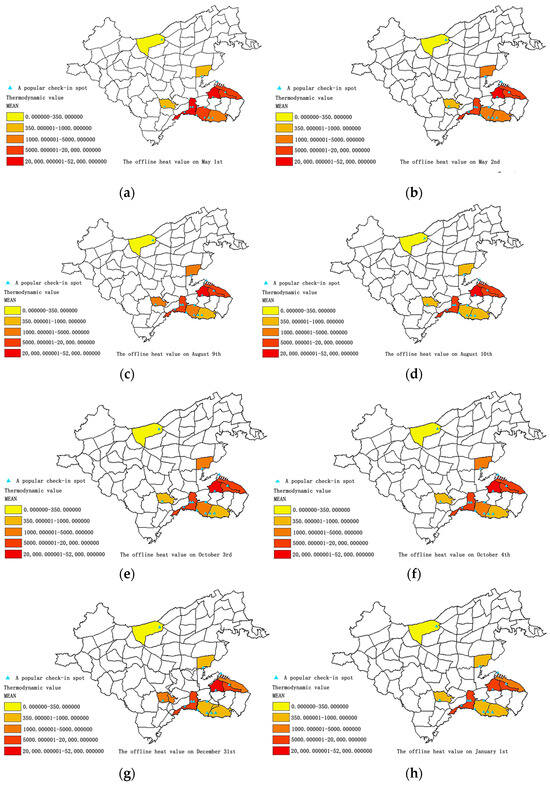 Daily frequency check data of the hotspots in Dalian’s coastal Internet-famous streets by time and space. (a–h) are the offline heat value on 1st May, the offline heat value on 2nd May, the offline heat value on 9th August, the offline heat value on 10th August, the offline heat value on 3rd October, the offline heat value on 4th October, the offline heat value on 31st December, and the offline heat value on 1st January.