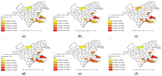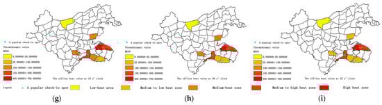 The temporal and spatial dynamics of the popularity of Dalian’s coastal Internet-famous streets are measured at different time points. (a–i) are the offline heat value at 6 o’clock, the offline heat value at 8 o’clock, the offline heat value at 10 o’clock, the offline heat value at 12 o’clock, the offline heat value at 14 o’clock, the offline heat value at 16 o’clock, the offline heat value at 18 o’clock, the offline heat value at 20 o’clock, and the offline heat value at 22 o’clock.