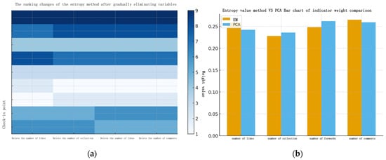 The ranking change chart of the entropy method after gradually eliminating variables and the bar chart comparing the weights of the entropy method vs. PCA index. (a,b) are the ranking changes of the entropy method after gradually eliminating variables and the entropy value method VS PCA Bar chart of indicator weight comparison.