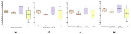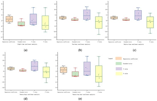 Nonlinear analysis box chart of offline Time periods in the popular Binhai Street area of Dalian City. (a–e) are the eight-time nonlinear analysis, the ten-hour nonlinear analysis, the twelve-time nonlinear analysis, the twenty-hour nonlinear analysis and the (e) represents the twenty-two hour nonlinear analysis.