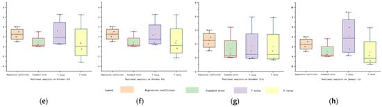 Box diagram of offline daily frequency nonlinearity analysis of Dalian Binhai Internet celebrity Street. (a–h) are the nonlinear analysis on 1st May, the nonlinear analysis on 2nd May, the nonlinear analysis on 9th August, the nonlinear analysis on 10th August, the nonlinear analysis on 3rd October, the nonlinear analysis on 4th October, the nonlinear analysis on 31st December, and the nonlinear analysis on 1st January.