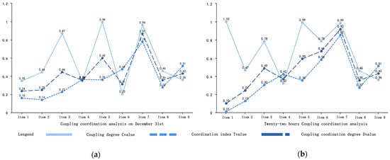 Coupling and coordination analysis of significant daily frequencies and time periods. (a,b) are the coupling coordination analysis on December 31st and the Twenty-two hours coupling coordination analysis.