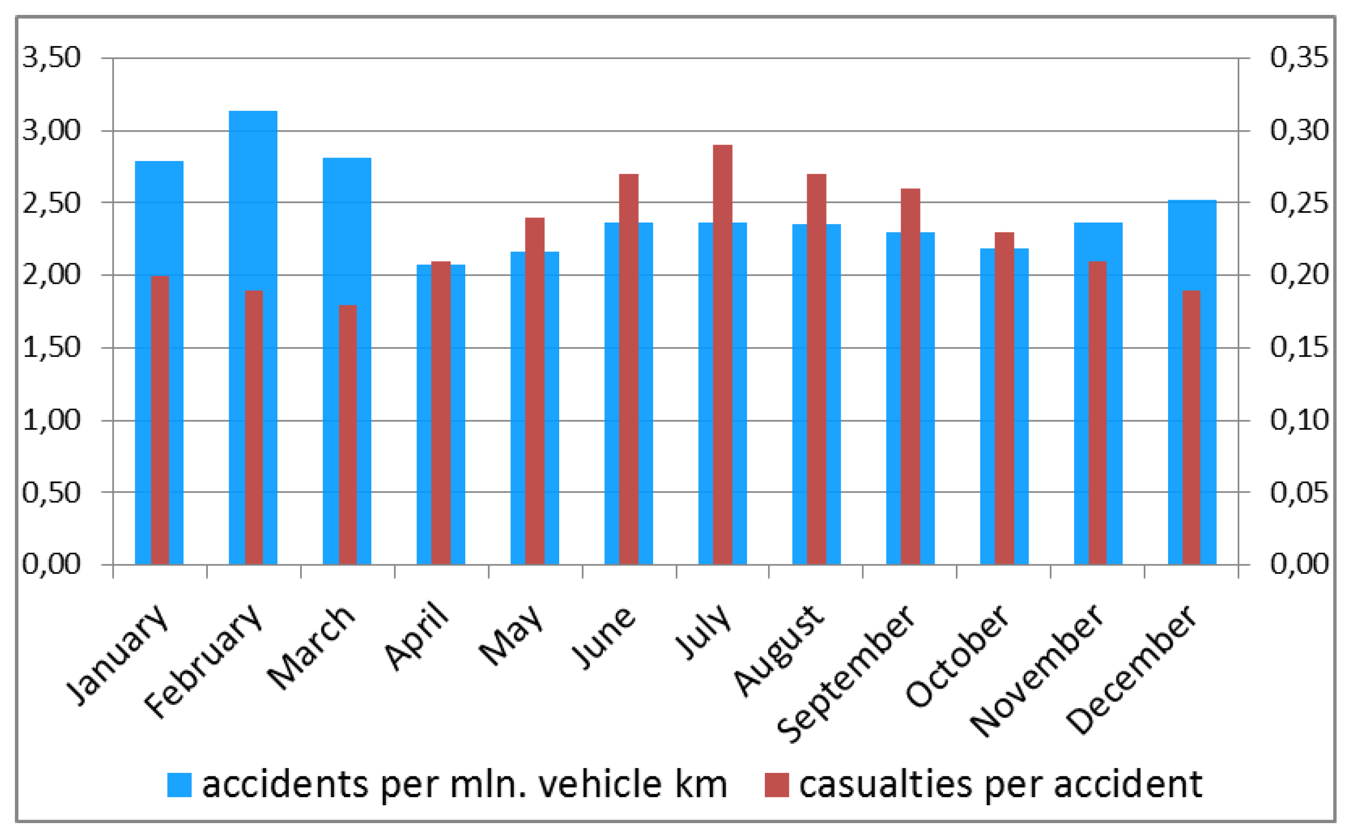 Monthly crash rates (crashes per million vehicle km) and average number of casualties per accident for the period 2000–2010. (crash rates: left-hand scale; casualties: right-hand scale). Source: study dataset (see Section 3).