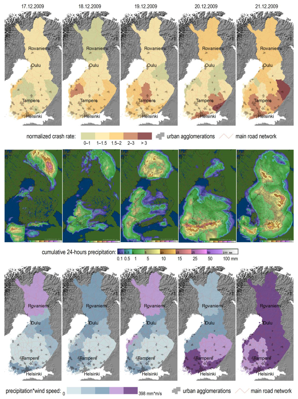 Spatially defined differences in the crash risk are, among others, related to traffic intensity, due to for instance higher population density in certain areas, but also to spatially defined differences, which often relate to weather conditions. Variations in the physical geography of regions often translate into structural differences in crash-relevant weather patterns. For instance, coastal provinces are subject to higher average and higher maximum wind speeds than inland regions (except for the hill tops in Lapland, but there is no traffic). The best way to illustrate this connection is to consider crash rates in different regions in relation to severe weather trajectories. Over the course of an unfolding storm trajectory during a day, detrimental conditions for traffic will not appear in the same location at the same time, or even do not appear at all in many regions located in the storm trajectory. Figure 4 illustrates this spatial variation for an extensive storm event over Finland during a nine-day period in December 2009. The first (upper) set of maps displays the daily crash rate per NUTS-3 region, normalized by the baseline average daily crash rate for the period November–December. The second (middle) set displays radar derivatives of the cumulative precipitation volume for each day. The third (lower) set displays the product of average wind speed and precipitation per day and region.