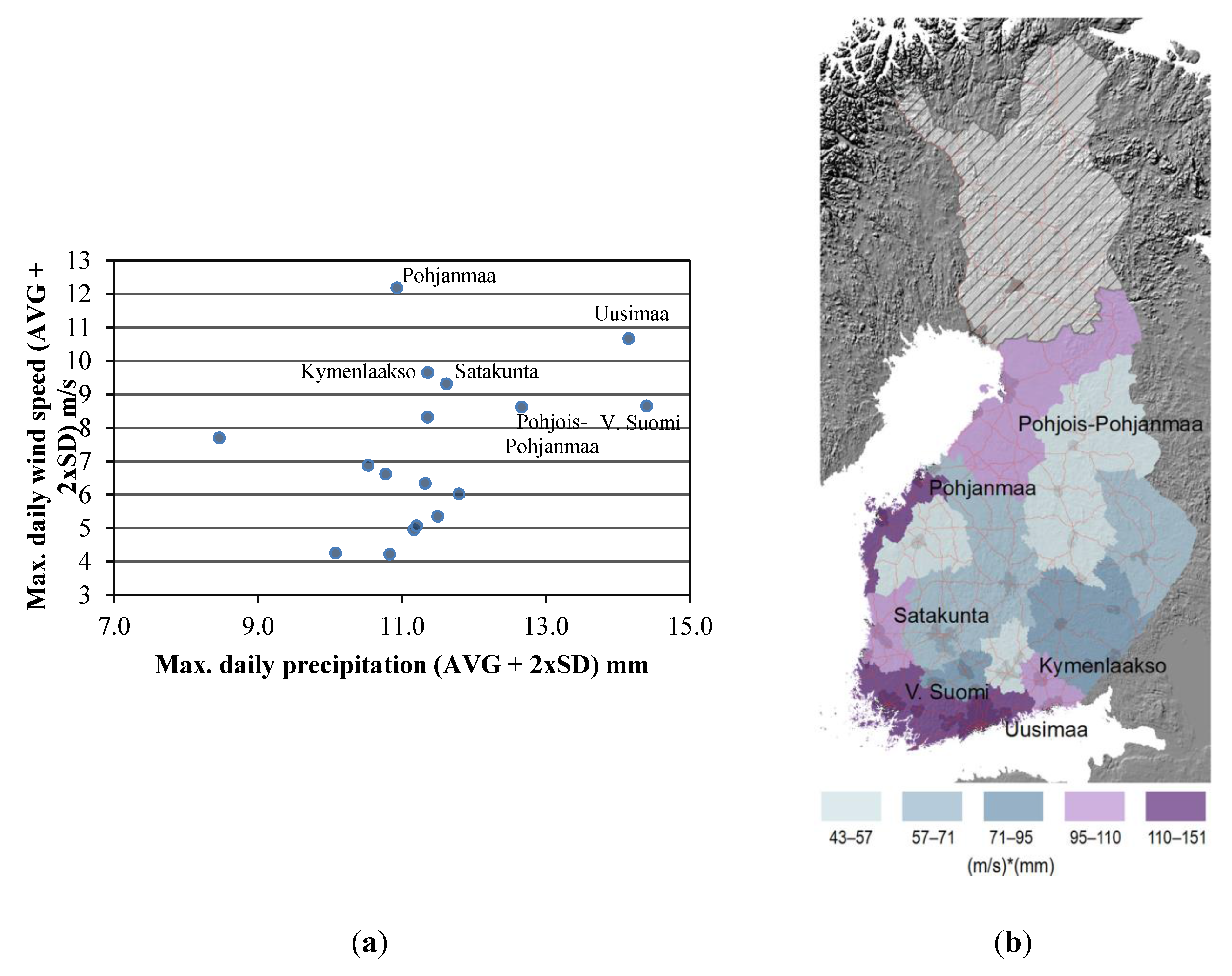 Apart from illustrating the spatial co-occurrence of bad weather and increases in car crashes, weather patterns have also spatial distributions which are relevant for the distribution of accident proneness across the country. This is illustrated by means of the structural co-occurrence of strong winds and intensive precipitation (in winter in this case) (Figure 5). When wind speed and precipitation jointly increase in strength, not only grip of tires, but especially visibility, deteriorates. Coastal areas are exposed to higher average and maximum wind speeds than inland areas. However, the intensity of heavy snowfall has a less pronounced spatial distribution (even though climate change may intensify extreme snowfall hazards along the Finnish south coast [32]). The spatial wind speed gradient seems to be stronger and clearer than the intense snowfall gradient, while it partly coincides with it. This implies that coastal areas are supposedly more prone to adverse weather induced car crash risks. As it happens, several of these areas are also more densely populated than an average Finnish region.
