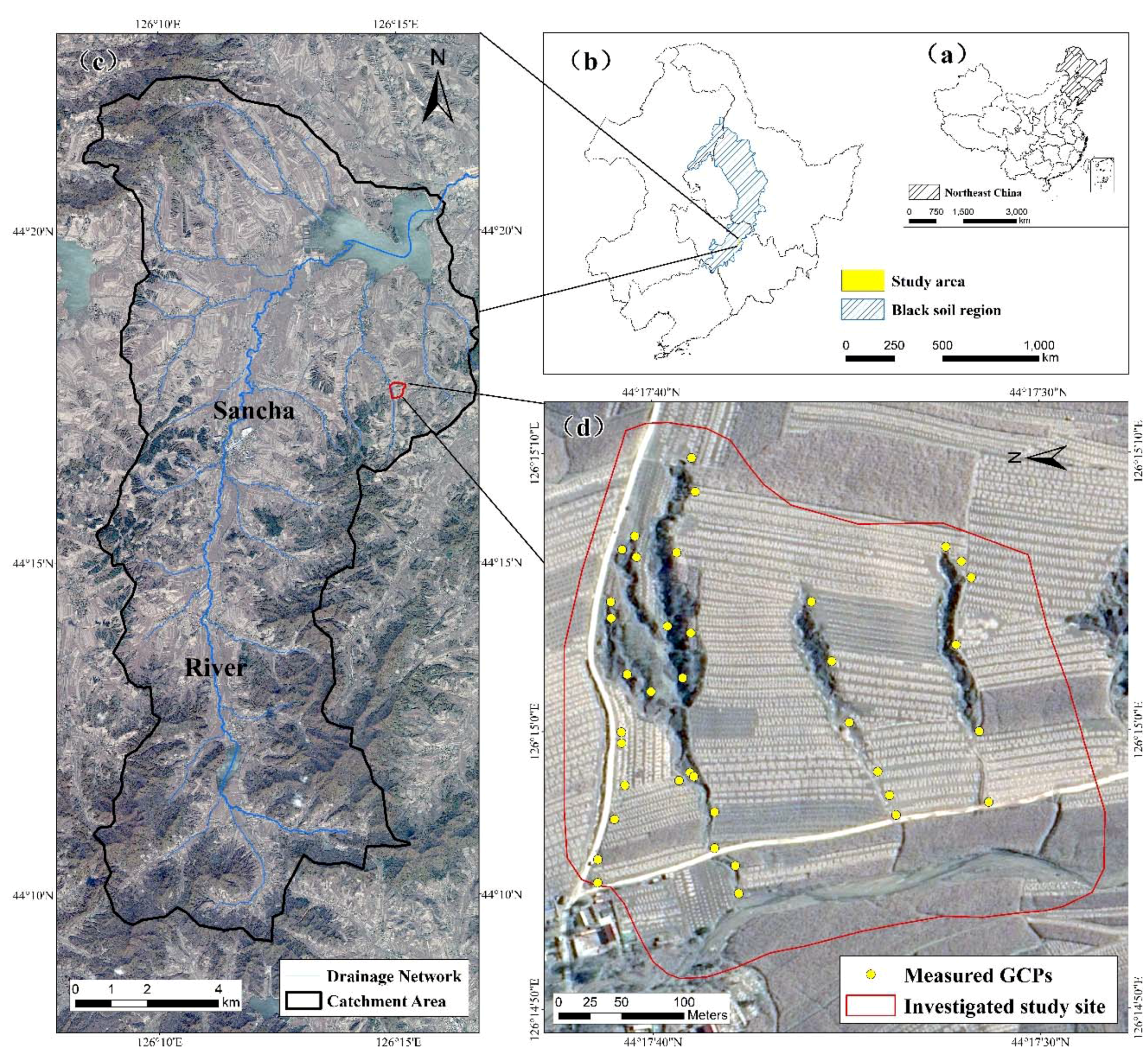 Location of the study area: (a) map of Northeast China; (b) map of the study area, situated at the southeastern edge of the black soil region; (c) overview of the study area with a detailed view of the survey site—the detailed RGB-321 Pleiades-1A satellite image includes the Sancha River catchment (12 October 2013); and (d) the investigated site was used for detailed mapping and the Ground Control Points (GCPs) were distributed over the site.