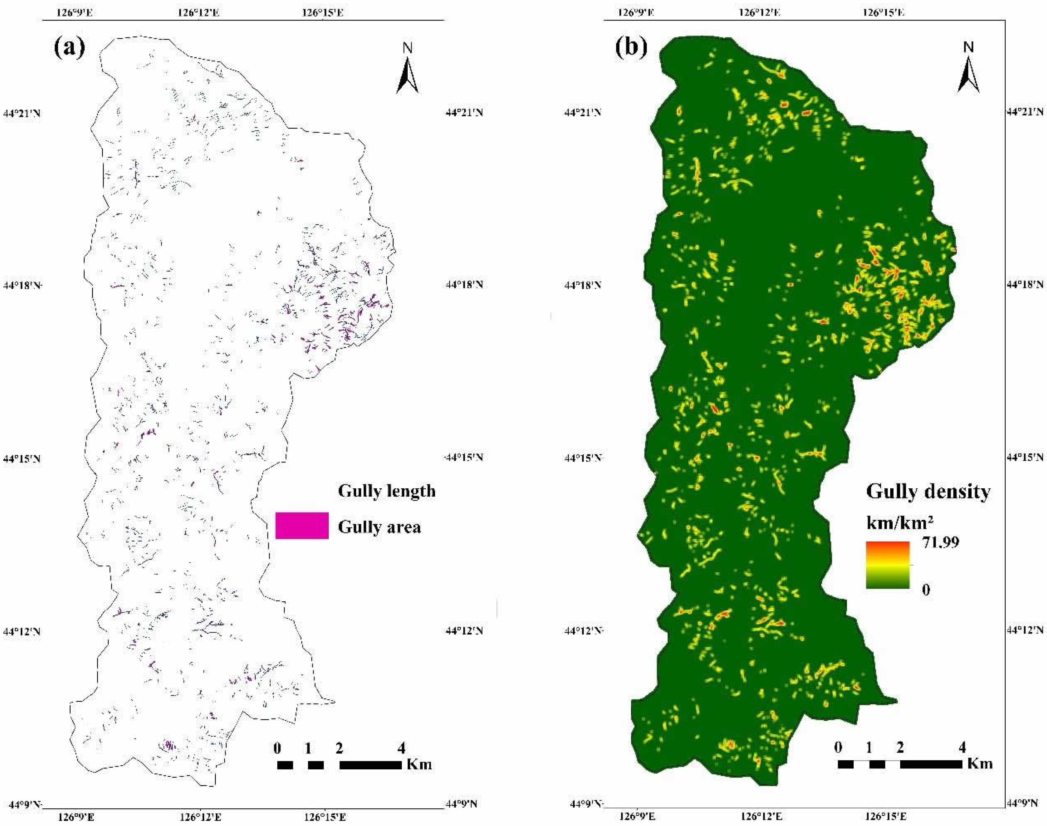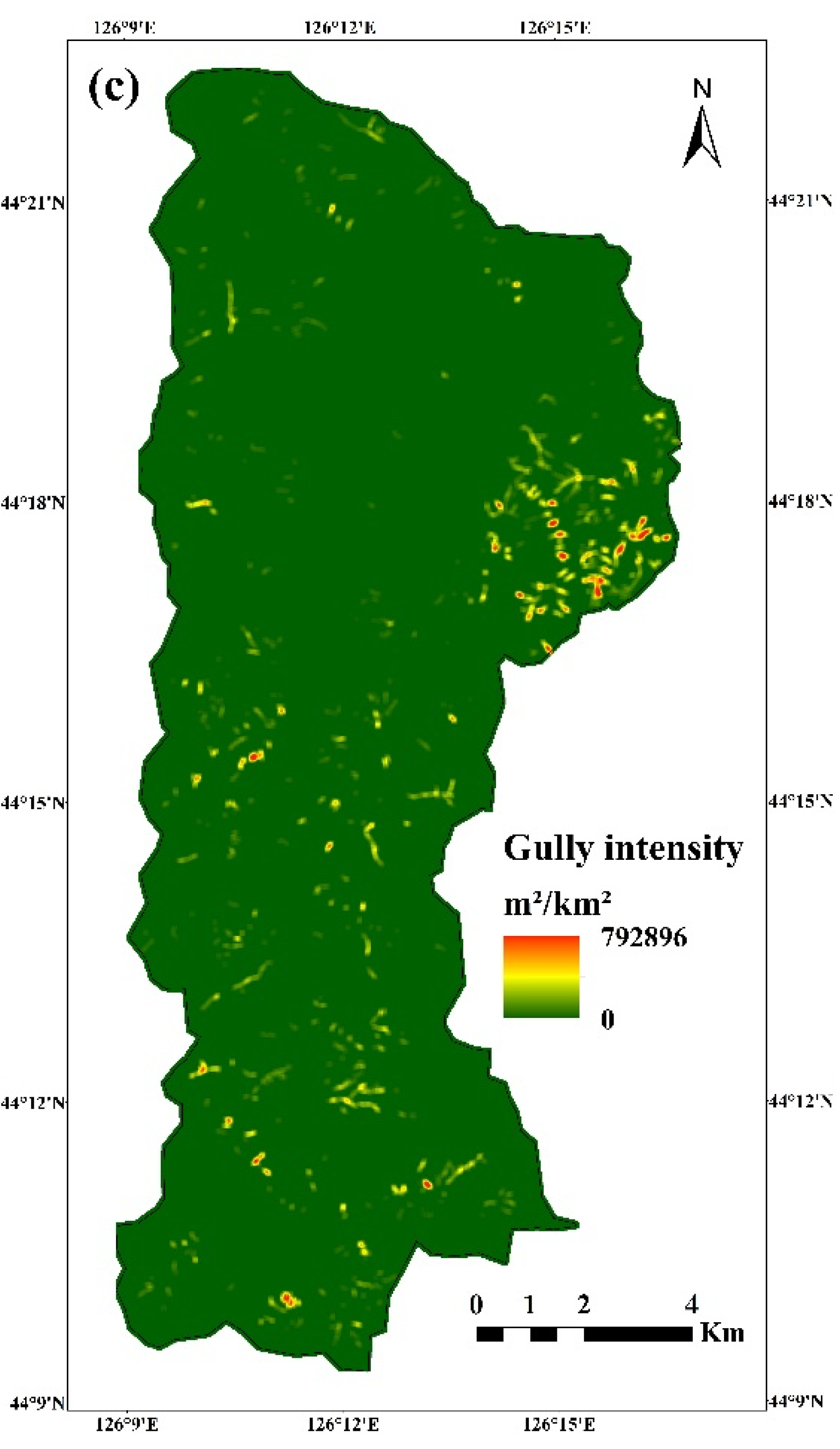 Figure 2 displays the spatial distribution of gully erosion across the Sancha River catchment. Figure 2a illustrates that gullies are widespread across the catchment, especially in the northeastern part. Figure 2b,c shows that the gully density and gully intensity ranged from 0 to 71.99 km/km2 and from 0 to 792,896 m2/km2, respectively. The results all indicate that gully erosion in the northeastern part was most serious. However, there are differences between the spatial distribution of gully density and intensity. The high gully intensity generally indicates that the lateral erosion of the gully erosion is significant, which results in notable widening of ditch sides and an increase in the area.
