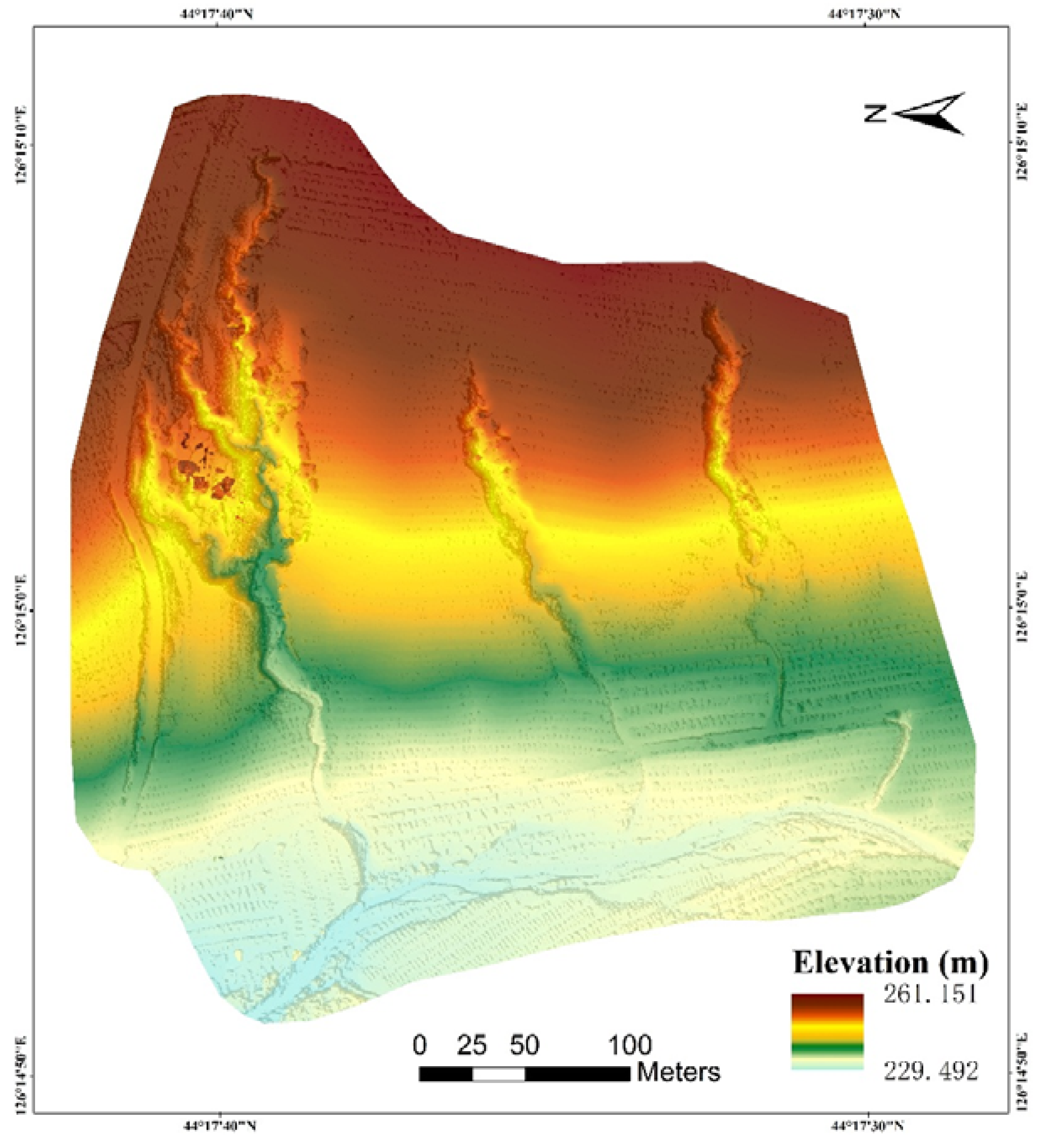 The study area (126°8′49″E–126°17′19″E, 44°9′18″N–44°22′20″N), including the middle and upper reaches of the Sancha River basin (Figure 1c), is located in Northeast China (Figure 1a,b), covering a total area of 163.83 km2. This area is situated at the southeastern edge of the black soil region (Figure 1b) and is covered by typical black soil, meadow soil, albic soil and dark brown soil. The region has a continental climate with a mean annual temperature of 5.3 °C and annual precipitation of 550–600 mm. Long-term human activities, especially excessive reclamation, resulted in a sloped farmland, with little vegetation coverage in the area. Due to the substantial terrain undulation, this region has suffered from severe soil erosion by water. As one of the most critical and destructive water erosion types, gully erosion is widely distributed in this area. Hence, the study area is one of the typical black soil erosion regions of Northeast China.