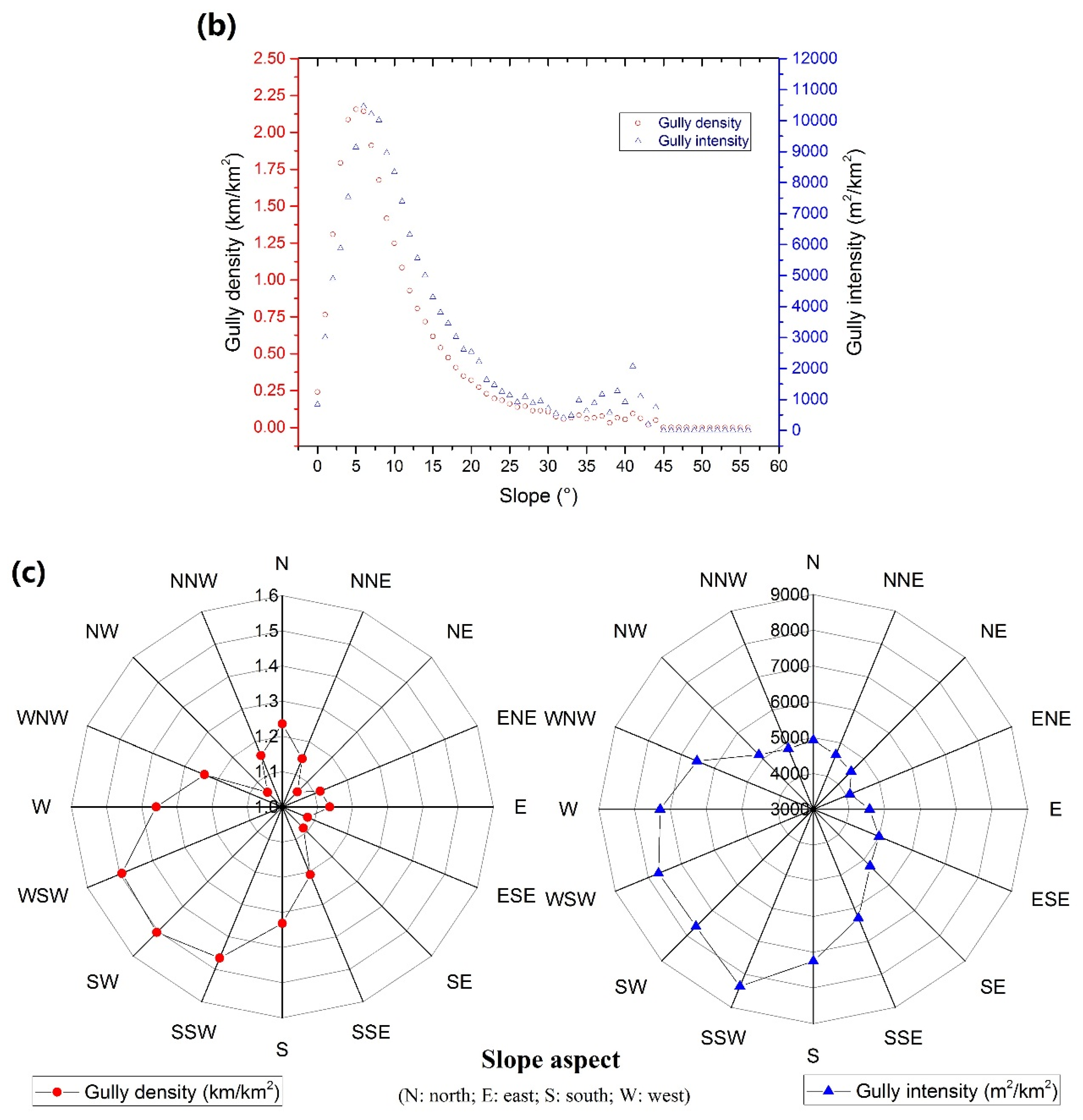 Topographic differentiation of gully erosion: (a) elevation; (b) slope; and (c) slope aspect.