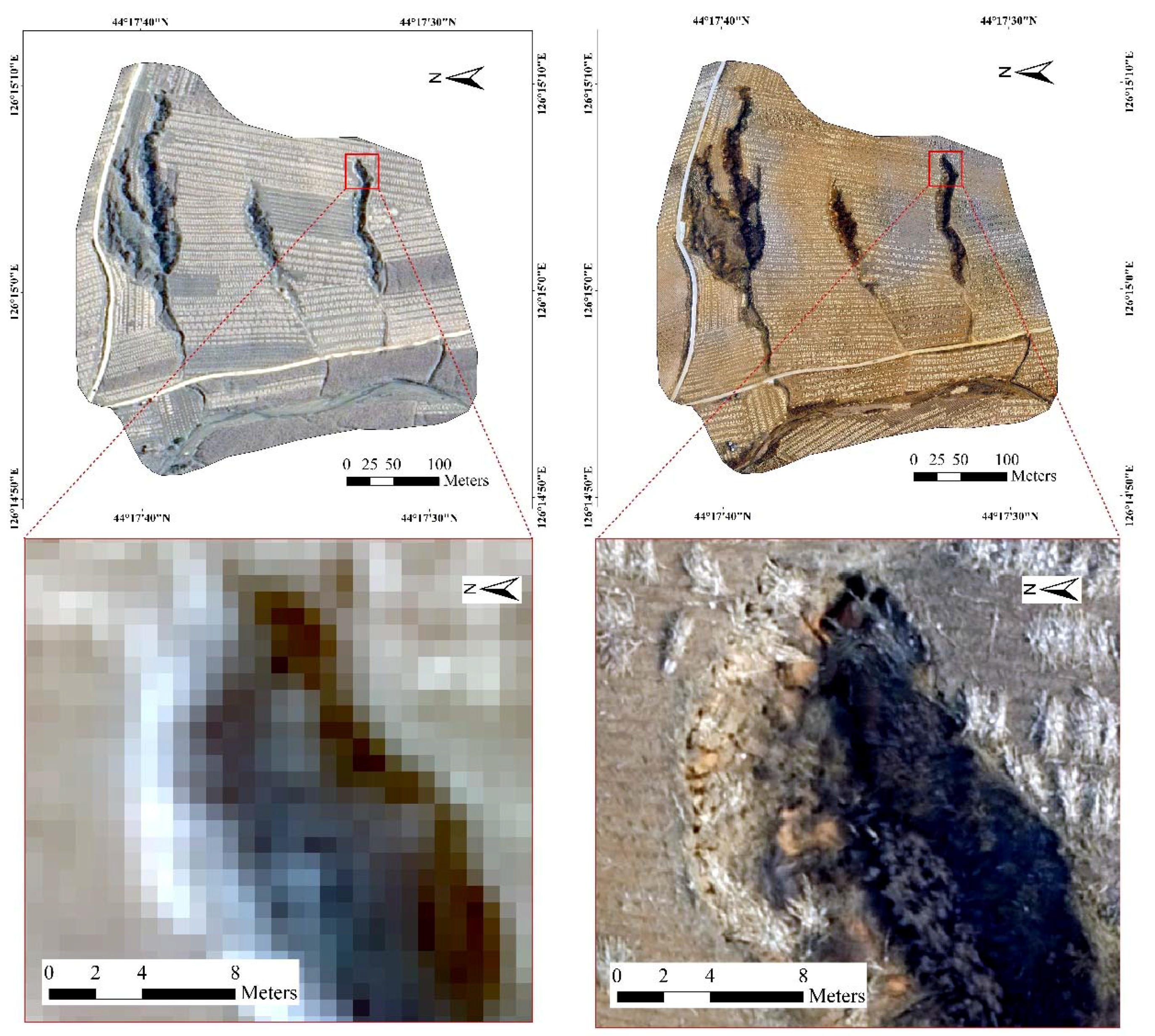 The previous gully mapping and monitoring studies were generally conducted at a single spatial scale to achieve a certain goal. Meanwhile, the data types achieved from different scales were too complex to be integrated properly. However, UAV-based remote sensing provides a valuable intermediate scale between the satellite scale and field scale [27]. The UAV-based remote sensing data can provide detailed 2D and 3D analysis of an individual gully at a small site scale, which is not possible at the satellite scale level. The satellite image can provide the surrounding environment of the individual gully. The obtained distribution data of various types of gullies at a large scale can be used for analyzing how the topographic factors control the formation and development of gully erosion. The two sources of remote sensing data can compare and complement each other at multiple scales.