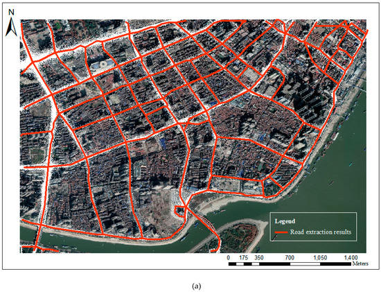 The final road network extraction results: (a) results of road network detection in Wuhan; (b) results of road network detection in Chicago.