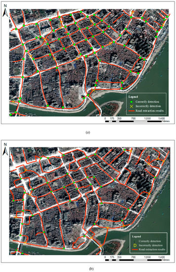 The final intersection extraction results: (a) results of the intersection detection in Wuhan; (b) results of the intersection detection in Chicago.