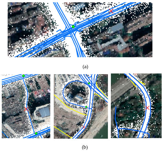 Based on the above rules, we set 80 meters as the fusion threshold value. The fusion results distinguish 79 true intersections, 4 false intersections, and 57 undetermined intersections, which are shown in Figure 10.