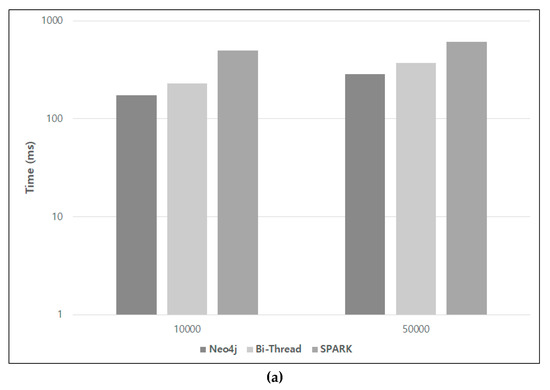 Figure 8 compares the execution time in the log scale of Neo4J, SPARK, and Bi-Thread on the experimental data. To make comparisons fair, the size of memory in Neo4J and SPARK was the same as RDBMS. As shown in Figure 8a, Neo4J yields better performance for small data (10K-nodes). SPARK requires more time to operate. Figure 8b compares the results of the relatively large real data. As seen in Figure 8, Neo4J performs better on the 2M-edge FLA data, but the proposed Bi-Thread performs better for graphs with more than 8M edges. In particular, errors occur often for some paths during the Neo4J execution while SPARK runs out of memory for all real data sets. The queries used in this experiment are described in Table 3. Q1, Q2, Q3, Q4, and Q5 are the queries for a short path using WEST data. For these queries, both approaches can be operated without errors and the Bi-Thread algorithm is faster than the other. However, the Bi-Thread approach is superior in queries Q6, Q7, and Q8. All of these queries require the computation for over 2000 nodes in a path. Additionally, the Neo4J could not be performed with these queries due to limitations with the memory. Although the performance of Neo4J degrades with large data, Neo4J is faster with small data compared to an RDBMS-based method such as Bi-Thread, which must perform a join operation insofar as it stores the relationships among the data along with the data. As a result, memory-based approaches, including Neo4J and SPARK, are not good for scalability and stability.