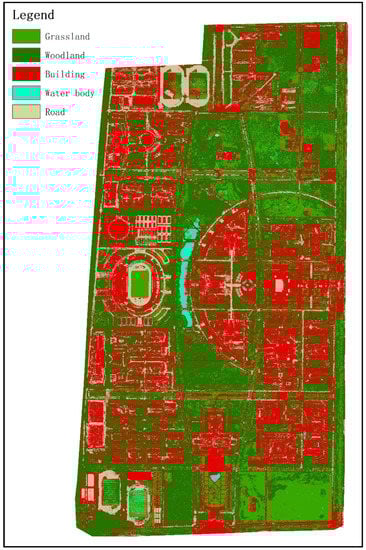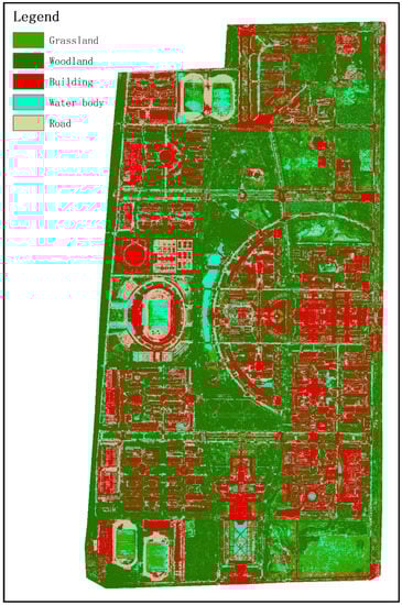When constructing the runoff generation and concentration model of urban rainwater and flood underlying surface, the underlying surface is usually divided into permeable lands (such as grassland, woodland, etc.), impermeable lands (such as buildings, roads, etc.), and water bodies (such as open channels, reservoirs, etc.) []. Among them, the infiltration of different land types in the permeable lands is different, which has a greater impact on the urban rainfall and flood surface runoff. The impermeable land not only provides important parameters for the urban storm runoff model [,], but also affects the temperature, evapotranspiration and soil water content of the city [,]. Water body refers to the impermeable land with stagnant storage capacity, usually without runoff. Therefore, it is necessary to re-integrate the clustering results of FCM and MKFCM-MRF models above to get the underlying surface types needed to construct the urban rainfall runoff model (as shown in Figure 7 and Figure 8).