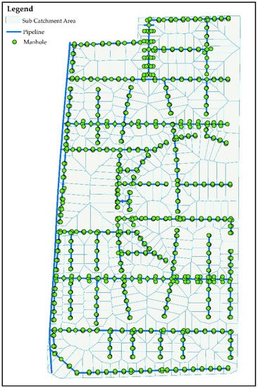 Since the 1960s, hydrological models and hydrodynamic models of urban storm floods have emerged endlessly. Many scientific research institutes and scholars in the United States [,], Britain [,], Denmark [], Australia [] and China [] have developed many kinds of urban storm flood models from the perspectives of simple concepts to complex hydrodynamics, or from statistics to certainty, such as TRRL(Transport and Road Research Laboratory) flood model, ILLUDAS, SWMM(Storm Water Management Model), UCURM, STORM, Wallingford, XP-SWMM, MIKE FLOOD, IFMS/Urban and so on, among which the SWMM is a widely used program for simulating urban runoff quantity and quality. Therefore, SWMM is selected as the urban flood model to validate the accuracy of land cover types in UAV images using MRF and MKFCM clustering techniques. The flight area of UAV is taken as the research object, which has 773 underlying sub catchment areas, and these sub catchment areas are connected with the rainwater pipe network. That is to say, urban storm flood has experienced three links: the urban runoff yield, the overland flow, and storm and sewer flow, as shown in Figure 10.