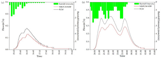 As can be seen from Figure 9 and Table 3, the SWMM simulation results of the MKFCM-MRF clustering algorithm and FCM clustering algorithm under different rainfall conditions (left figure: 12 August 2017; right figure: 24 July 2018) show that the change trend of flow duration curve is consistent and changes with the change of rainfall intensity. This is due to the same distribution of rainwater pipe network, the same number of rainwater wells, the same calculation principle, and the same set of parameters in SWMM model. Although different types of ground objects extracted by different clustering algorithms are used as the basic data of the model in the study area, they do not affect the trend of the flow duration curve of the outlet. Comparing the simulation results of SWMM under MKFCM-MRF and FCM clustering algorithm, we can see that the runoff producing time and the peak time of MKFCM-MRF algorithm are slightly delayed, and the peak flow and total runoff are also smaller. This is because under the same conditions of rainfall, sub catchment division and runoff path, impervious areas (roads) under FCM clustering algorithm is misclassified into pervious areas, which increases the area of surface runoff, while the water bodies in MKFCM-MRF clustering are misclassified as impervious areas, however, because the area of water body in the whole study area is very small, so the overall impact is not large.
