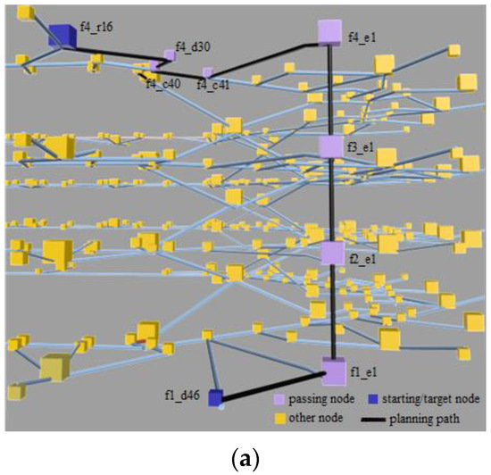 The semantic setting of the path accessibility environment of the fire scene is shown in Table 5. The ideal path planning situation in the simulation of all areas in scenario 1 is not on fire, and the obstacles in the path that hinder the passageway are as follows. In scenario 2, we simulated path planning when a fire occurs with obstacles. The experimental results are shown in Figure 9. The results of the indoor routing algorithm for the fire scenes are shown in black lines in Figure 9a in the absence of a fire in scenario 1. The sequence of nodes passed is f4_r17 → f4_w20 → f4_c43 → f4_c41 → f4_e1 → f3_e1 → f2_e1 → f1_e1 → f1_d46. In scenario 2, it was assumed that a fire occurs in the building, the door node f4_d22 in room A414 corresponding to f4_r17 is locked (red node in Figure 9b), and there are flammable and explosive objects from f1_c34 to f1_d46 (red section in Figure 9b). The results of the path planning in this case are shown as black lines in Figure 9b. The order of the nodes passed is f4_r17 → f4_d22 → f4_c42 → f4_c41 → f4_c40 → f4_d47 → f4_s07 → f3_s08 → f3_s07 → f2_s08 → f2_s07 → f1_s08 → f1_s07 → f1_d45 → f1_c33 → f1_d28 → f1_r16 → f1_w14. A comparison of the planned routes for scenarios 1 and 2 shows that when a fire does not occur, the elevator acts as a transit node and its state is reachable. At this time, the user can directly reach the first-floor exit via the elevator. Once a fire occurs, the elevator nodes are unreachable for safety concerns. Stairs are used as the vertical channel for evacuation. The planned path of the algorithm also effectively avoids unreachable nodes and flammable and explosive objects. This is because when there are unreachable nodes and flammable and explosive objects according to the indoor 3D navigation traffic cost function proposed in this paper. When planning the shortest path using the A* algorithm,