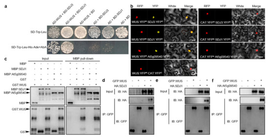 The WUS cDNA was cloned into pGEX vector and pMBP-c vector, respectively. SDJ1/SDJ3/At5g09540 cDNAs were also cloned into pMBP-c vector, respectively. The target proteins were expressed in E. coli BL21 with the induction of 0.25–1.0 mM isopropyl β-d-1-thiogalactopyranoside (IPTG) for 9 h at 16 °C or 22 °C and purified using glutathione resin (Thermo Fisher Scientific, Waltham, MA, USA) or amylose resin (New England Bio-Labs, Ipswich, MA, USA).