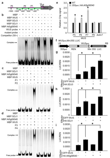 Previous studies demonstrated that WUS protein can bind to TAAT motif in the promoter of downstream target genes []. WUS promoter also contains many TAAT motifs, indicating that WUS might bind to its own promoter for self-regulation. We examined whether SDJ1/SDJ3/At5g09540 proteins might bind to WUS promoter via interaction with WUS protein as a complex using electrophoretic mobility shift assay (EMSA). Our results showed that WUS protein can specifically bind to TAAT motif in a WUS promoter probe. The substitution of TAAT motif with CCCC abolished the binding to WUS protein to this promoter probe. WUS protein bound to its promoter more efficiently in the presence of SDJ1, SDJ3, and At5g09540 proteins, respectively (Figure 2a,b). SDJ1 and At5g09540 proteins on their own failed to bind to WUS promoter when different promoter regions were used in EMSA (Figure 2c,d). However, the binding of At5g09540 to different regions (P5–P7) of WUS promoter, but not coding region (P8), in 35Spro::HA:At5g09540 plants was confirmed using Chromatin immunoprecipitation (CHIP) assay (Figure 2e), demonstrating that At5g09540 protein can bind to WUS promoter via the interaction with endogenous WUS protein as a complex.