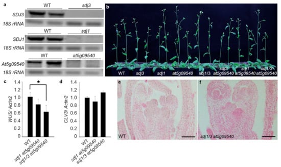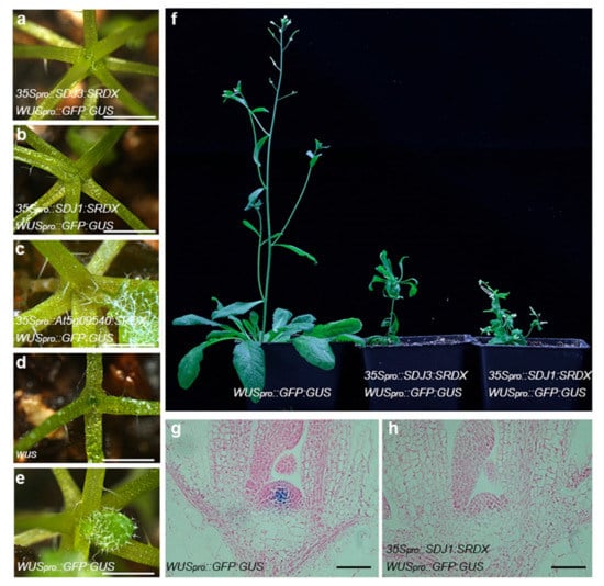 All constructs were introduced into Col-0 by Agrobacterium tumefaciens PMP90 strain according to the reported floral-dip protocol []. At least three independent transgenic lines were used for subsequent analyses. The sdj3 mutant (Salk_016979), sdj1 mutant (Salk_021078), at5g09540 mutant (SAIL_735_A07), and wus mutant (Salk_114398) were ordered from the European Arabidopsis Stock Centre. All plants were grown in soil at 22 °C under long days (16 h light/8 h dark) with white fluorescent light (120 μmol·m−2·s−1).