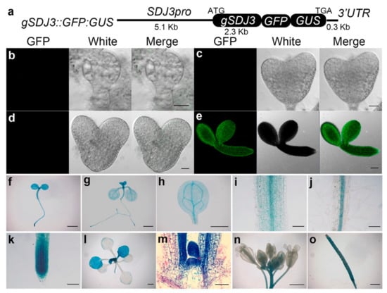 Expression of SDJ3 gene in different organs at different developmental stages. (a) Diagram of gSDJ3::GFP:GUS construct. (b–e) SDJ3:GFP:GUS fusion protein is expressed at mature stage (e), but not global stage (b), heart stage (c), and torpedo stage (d) during the embryogenesis of gSDJ3::GFP:GUS plant by GFP fluorescence scanning. (f–o) Expression of SDJ3:GF:GUS fusion protein in 3-day-old seedling (f), 7-day-old seedling (g), cotyledon (h), hypocotyl (i), root (j), and RAM (k) of 7-day-old seedling, 14-day-old seedling (l), SAM of 14-day-old seedling (m), Flower (n), and Silique (o) examined by GUS staining. Scale bar= 10 μm in (b–d); 50 μm in (e,m); 1000 μm in (f–l,n) and o; 100 μm in (i–k).