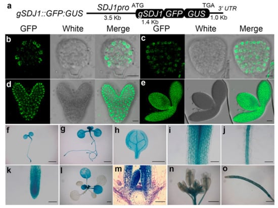 Expression of SDJ1 gene in different organs at different developmental stages. (a) Diagram of gSDJ1::GFP:GUS construct. (b–e) SDJ1:GFP:GUS fusion protein is expressed at global stage (b), heart stage (c), and torpedo stage (d), and mature stage (e) during the embryogenesis of gSDJ1::GFP:GUS plant by GFP fluorescence scanning. (f–o) Expression of SDJ1:GFP:GUS fusion protein in 3-day-old seedling (f), 7-day-old seedling (g), cotyledon (h), hypocotyl (i), root (j), and RAM (k) of 7-day-old seedling, 14-day-old seedling (l), SAM of 14-day-old seedling (m), Flower (n), and Silique (o) examined by GUS staining. Scale bar= 10 μm in (b–d); 50 μm in (e,m); 1000 μm in (f–l,n) and o; 100 μm in (i–k).