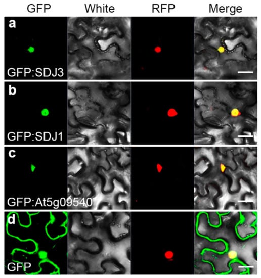 35Spro::GFP:SDJ3, 35Spro::GFP:SDJ1, and 35Spro::GFP:At5g09540 constructs in combination with 35Spro::Coilin:RFP construct were introduced into Nicotiana benthamiana leaves through Agrobacterium infiltration. Then the colocalization of GFP:SDJ1, GFP:SDJ3 and GFP:At5g09540 proteins with Coilin:RFP protein in nucleus was examined using a confocal laser scanning microscope (Zeiss LSM 780) three days later after Agrobacterium infiltration.