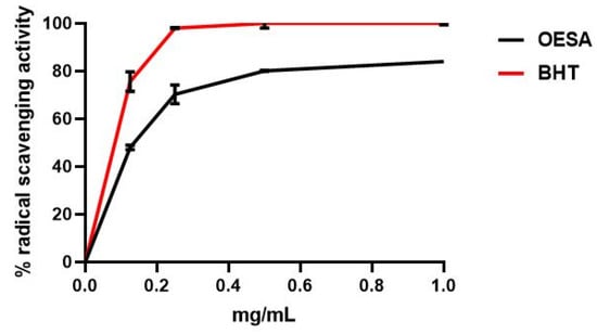 The DPPH assay is based on the reduction of the stable radical, DPPH, to the formation of a nonradical form in the presence of hydrogen donating antioxidants. Therefore, the antioxidant activity was determined by monitoring the scavenging of the free radical DPPH in presence of the OESA. The DPPH working solution was obtained by mixing the stock solution (200 µL in 1 mL Me OH) with 500 µL of DPPH (0.2 mM), purchased from Merck (Darmstadt, Germany). The final volume was brought to 1 mL with distilled water, shaken vigorously and allowed to reach a steady state at room temperature for 1 h. Aliquots of various concentrations of the OESA extracts (0, 0.125, 0.25, 0.5, 1 mg/mL) and standard antioxidant were mixed with DPPH (0.2 mM) and incubated for 1h in the dark. After 1 h of reaction, the mixtures were poured into an optical glass cuvette and immediately placed in a spectrophotometer. The absorbance was taken at 517 nm using Beckman spectrophotometer (Bichrom Libra S32 (Beckman, Fullerton, CA, USA) []. Butylhydroxytoluene (BHT) (SIGMA, St. Louis, MO, USA) was used as a standard antioxidant. The DPPH radical scavenging activity was calculated according to the following equation: