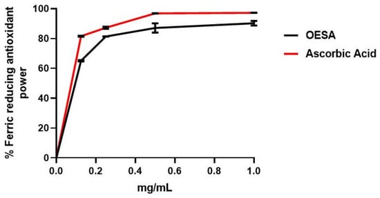 The reducing power of OESA was determined according to the Oyaizu method []. According to this method, aliquots of various concentrations of the standard and the OLCS extracts (0.06 to 1 mg/mL) were mixed with 1 mL of (pH 6.6) 200 mM phosphate buffer and 1 mL of (1%) potassium ferricyanide (K3Fe (CN)6). The mixture was incubated at 50 °C for 20 min. Then, 1 mL of (10%) trichloroacetic acid (TCA) was added to the mixture which was centrifuged at 3000 rpm for 10 min. The upper layer of solution (1.5 mL) was mixed with 1.5 mL of deionized water and 0.1 mL (0.1%) ferric chloride solution (FeCl3). The absorbance was measured at 700 nm in a UV spectrometer. A blank was prepared without adding extract. Ascorbic acid at various concentrations (0 to 1 mg/mL) was used as standard. The reduction of ferric ion (Fe3+) to ferrous form (Fe2+) by OESA produces an intense blue light revealed as a change in absorption at 593 nm related to an antioxidant standard.