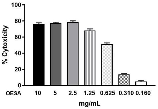The cytotoxic effect of OESA was studied on Raji cell lines by the MTT assay. Then, the cells (6 × 104/well) were cultured in 96-well plates for 48 h, with dilutions of OESA (0.16 mg/mL, 0.31 mg/mL, 0.625 mg/mL, 1.25 mg/mL, 2.5 mg/mL, 5 mg/mL, 10 mg/mL) for 72 h. The percentage of cytotoxicity was calculated as reported in Materials and Methods. Starting from the concentration of 10 mg/mL to 2.5 mg/mL, OESA induced strong cytotoxicity. A moderate effect was detected following 0.625 mg/mL of OESA; conversely, lower concentrations did not shown cytotoxicity. Besides, based on these results, the CC50 values, indicative of 50% cytotoxic concentration, was 0.8773 mg/mL. Therefore, the 0.31 mg/mL concentration of OESA was selected for further experiments (Figure 3).