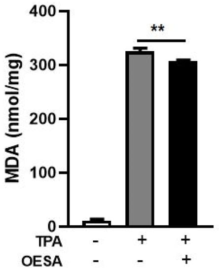 MDA assay: effect of OESA on MDA production in Raji cells after 48 h induction of viral cycle. Raji cells were exposed, or not, to TPA (8 nm) and OESA (0.31 mg/mL) simultaneously at a noncytotoxic concentration of 0.3 mg/mL. The levels of MDA produced was evaluated by the determination of thiobarbituric acid reactive substances. The data were expressed in nmol/mg of protein (**: p < 0.01). Results were expressed as mean ± standard deviations (n = 3).