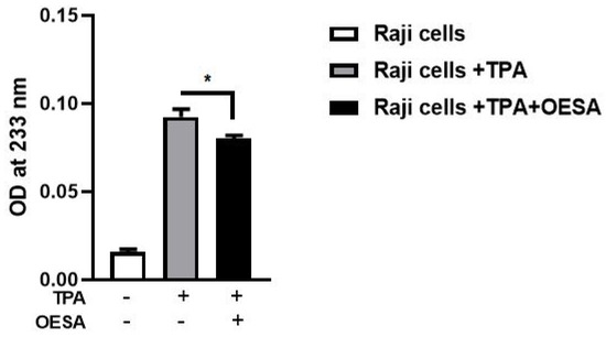 To further confirm the role of OESA as a scavenger of lipid peroxidation, DC levels were measured after the induction of the lytic cycle. DC was produced during the initial stages of lipid oxidation and by breaking down the polyunsaturated fatty acids. Raji cells, untreated or treated with TPA alone or in combination with OESA (0.3 mg/mL). Our data showed a significant reduction in DC levels in Raji cells after EBV lytic cycle induction (p < 0.05) (Figure 5).