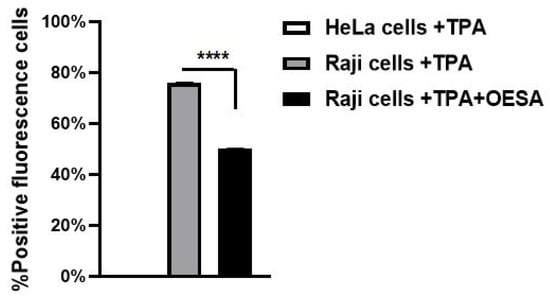 Antiviral effect of OESA in the Raji cells line. Raji cells were stimulated with TPA, exposed to OESA (0.31 mg/mL), incubated with primary antibody, and labeled secondary antibody. The values represent the percentage of fluorescence cells. Asterisks indicate significant differences compared to OESA-untreated sample. (**** p < 0.0001). Results were expressed as mean ± standard deviations (n = 3).