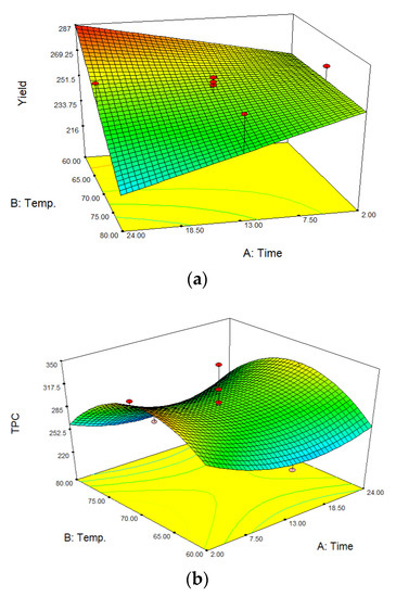 Through multiple regression analysis of the experimental data, the model for predicted response Y identified as TPC and yield could be expressed with the following quadratic polynomial equation, presented in Figure 1.