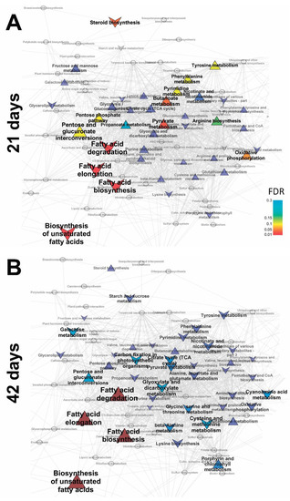 To determine which biochemical pathways were affected by mycorrhization, a Metabolite Set Enrichment Analysis (MSEA) was performed based on the values of the predictive component loadings and the KEGG pathway metabolite sets. As presented in Figure 5, the intensity of the pathways of fatty acid synthesis and sterols was decreased at day 21. At the same time, a specific increase in the content of intermediates of oxidative phosphorylation, carboxylate exchange, and pentoses was revealed, which indicates the activation of these pathways. With caution, we can talk about aromatic amino acids exchange increase.