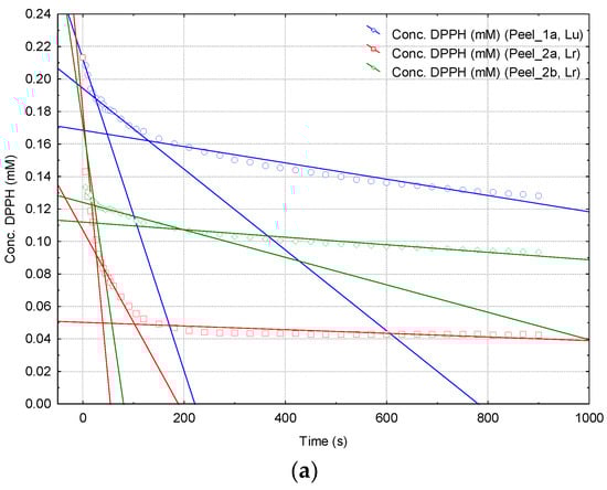 For papaya extracts, three pseudo-linear time ranges in the Concentration (DPPH·) versus Time plot can be observed. In the first time range of 0–30 s a fast reaction of antioxidant compounds with DPPH· appears. In the second and third time ranges of 30–80 s and 80–900 s, the reaction rates are consistently lower (see Figure 5 and Supplementary Material File). Thus, the mean DPPH· reaction rates for these three time ranges (vmean(1–3), μM/s) were determined according to the following equation (Equation (3)), where ΔConc. stands for the variation of the DPPH· concentration (μM) during the time range Δt (s), for the above-mentioned time ranges (“1” for 0–30 s, “2” for 30–80 s and “3” for 80–900 s), (Equation (3)).